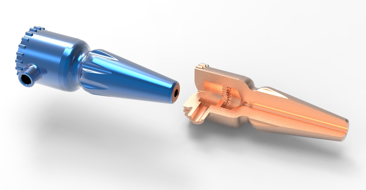 Suspension liquid enters the gas flow in the supersonic part of the nozzle and is atomized by the gas cross-flow. The tube connected to nozzle which supplies the suspension has a 1/4" male adapter, so a 1/4" female thread will be needed.