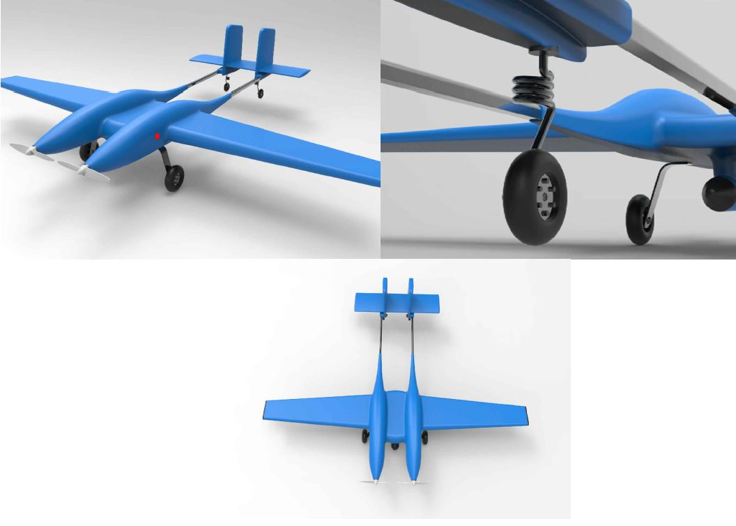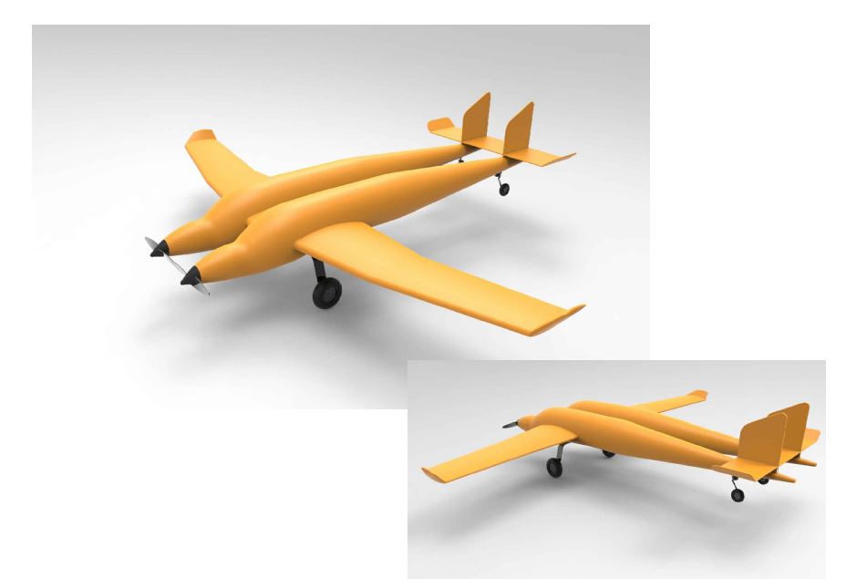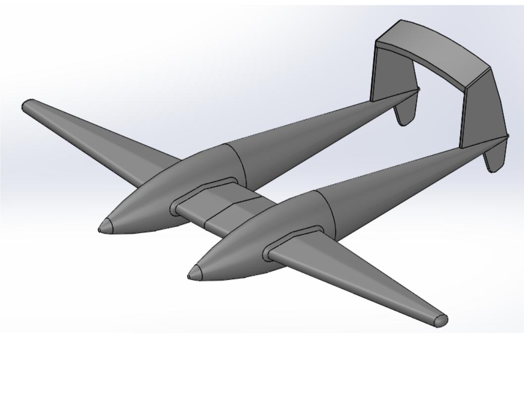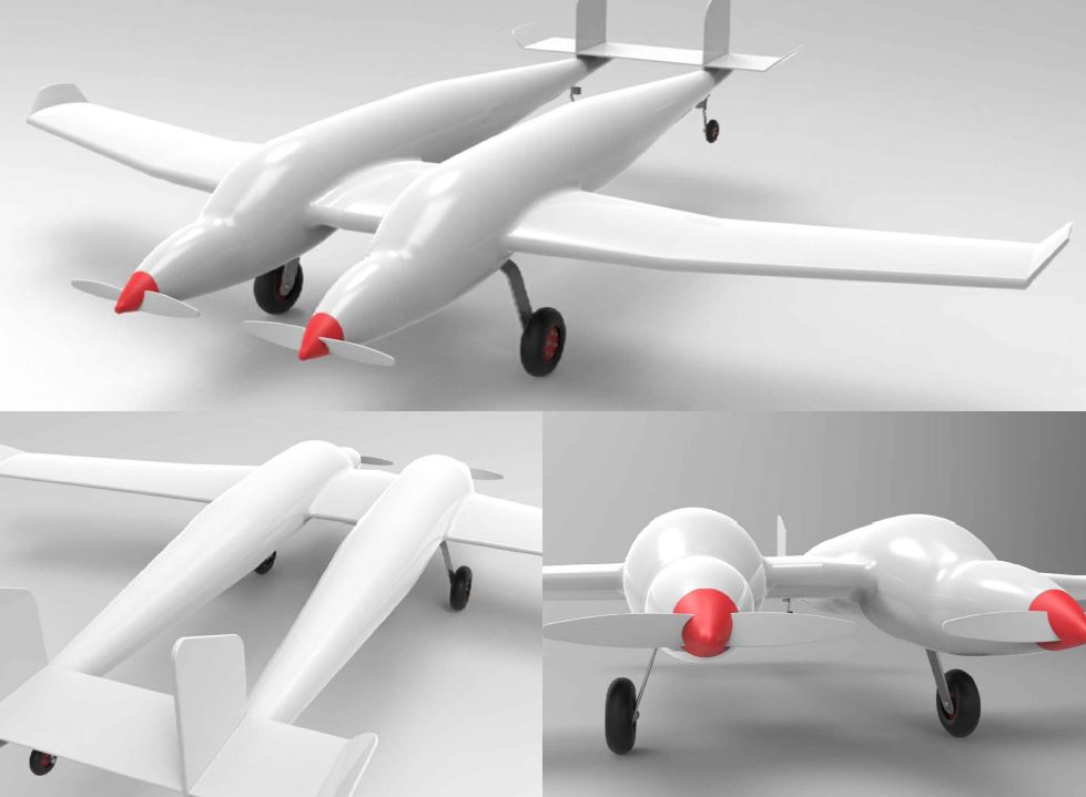 I need a 3D CAD file of a conceptual twin fuselage or twin tail aircraft similar to the images attached. The wing span will should be about 7 feet long. This should not have a cockpit, or mufflers, scoops (unless require) as this will be an electric aircraft concept.