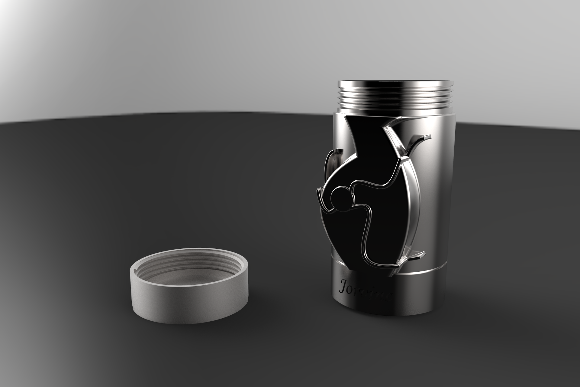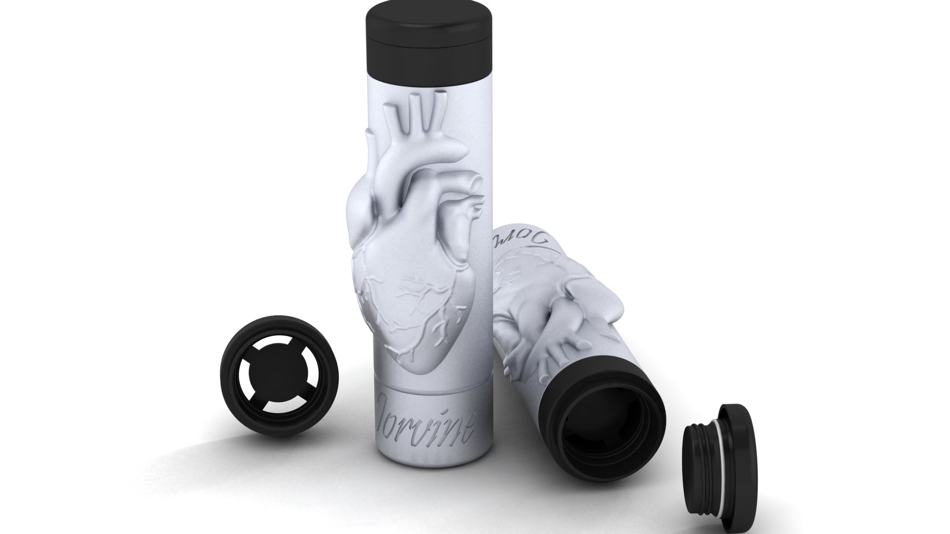 My company as of now will sell stainless steel water bottles. The bottle will be designed to keep beverages cold for 24 hours and hot for 12 hours. The purpose of the design will be for me to send it to a company that will mass manufacture the bottle.The heart portion needs to appear more as if it is coming from the inside out vs it being screwed or glued on to the outside of the bottle as it is pictured. It would also only read 'Jorvine'.